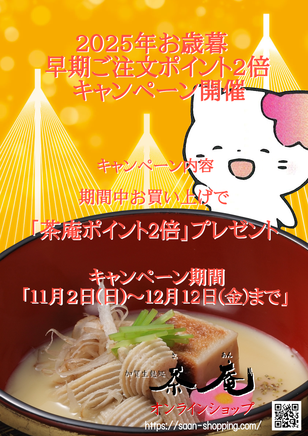2025年11月「2025年お歳暮 早期ご注文ポイント2倍キャンペーン(期間中お歳暮を早期ご注文で茶庵ポイント2倍)」を開催致します。期間:2025年12月12日(金)まで