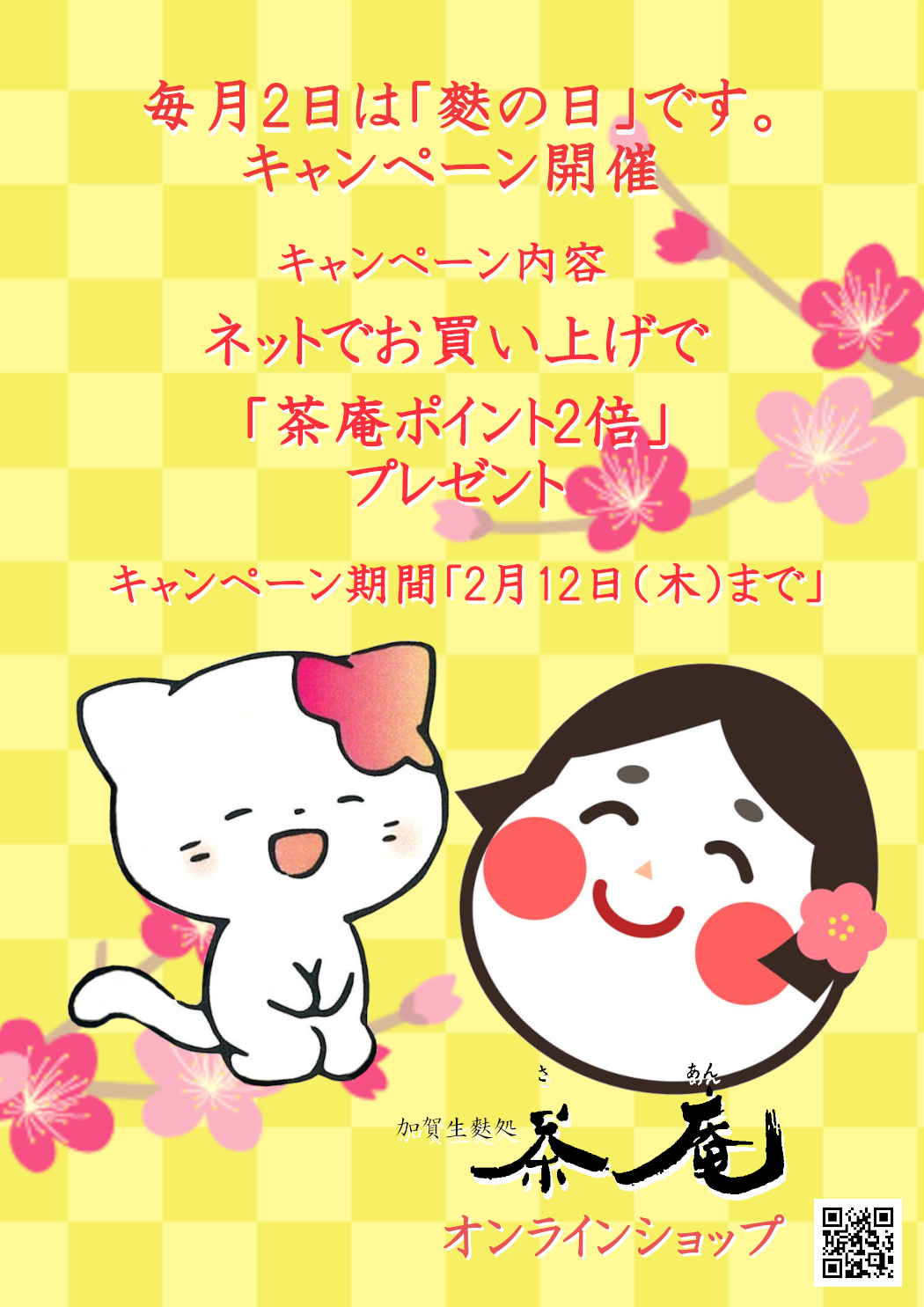 3. 2026年2月「毎月2日は麩の日キャンペーン(ネットでお買い上げで茶庵ポイント2倍)」を開催致します。期間:2026年2月12日(木)まで
