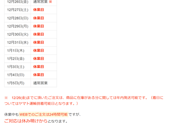 「年末年始の休業日」のご案内(期間:2025年12月27日~2026年1月4日)